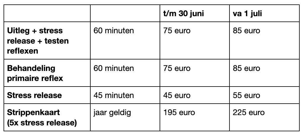 In alle behandelingen is standaard enige uitloop voorzien. Onvermijdbare uitloop die de gereserveerde tijd overschrijdt wordt per kwartier doorberekend tegen €60,00 p/u.